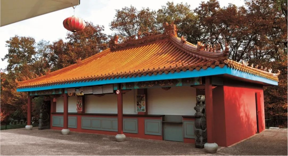 法国动物园“熊猫馆”采用苏式彩绘工艺,中式图案吊顶,梁架、斗拱、望、装修为实木结构,琉璃瓦屋面仙人走兽脊为深黄色。