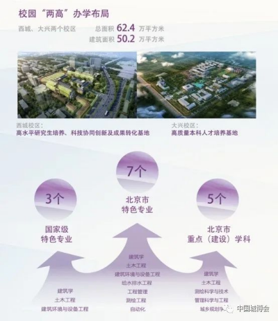 北京建筑大学是北京市和住房城乡建设部共建高校,北京地区唯一所建筑类高校。学校创始于1907年清政府成立的京师初等工业学堂。学校诞生于二十世纪初科技救国、实业强国的历史背景下,开创了我国职业教育的先河。从抗日战争、解放战争到新中国成立、改革开放和现代化建设,从职业教育的发端到恢复高考、建立学位制度和高等教育的飞速发展,伴随着民族解放和国家富强,一代代北建大人求真务实、艰苦创业,始终与祖国共奋进、与时代同发展,留下了无数享誉世界的建筑杰作,谱写了一曲气壮山河的建设者之。在漫长的办学历程中,学校与国家和民族同呼吸共命运,承载着注重实业、立志报国的文化基因,形成了爱国奉献、坚毅笃行、诚信朴实、敢为人先的北建大精神和实事求是、精益求精的校训,成为推动今曰蓬勃发展、铸就明天灿烂新篇的动力源泉。学校服务国家和北京重大战略需求,始终与北京城市建设共奋进。从新中国成立之初的人民大会堂等“十大建筑到北京亚运会、奥运会等重大工程;从天安门、故宫修缮,前门大街改造等北京历史文化名城保护项目到四通八达的道路交通网、海绵城市和智慧城市建设,从首都总体规划、新型城镇化建设到北京城市副中心雄安新区建设,处处凝结着学校师生校友的智慧和汗水学校秉承立德树人、开放创新的办学理念,坚持服务首都城市战略定位,服务国家城乡科学发展”,以培养与造就古都北京的保护者、宜居北京的营造者、现代北京的管理者、未来北京的设计者、创新北京的实践者为己任,为国家输送了6万多名优秀毕业生,涌现出10余位全国工程勘察设计大师,成为推动首都乃至全国城乡建设的重要力量。
