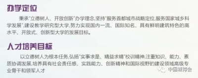 风雨沧桑百余载,砥砺奋进一世纪。“十三五期间,北京建筑大学将以党的十九大精神和习近平新时代中国特色社会主义思想为指引,以国家统筹推进一流大学和一流学科建设为导向,把准首都北京新定位、建筑业转型升级、京津冀协同发展和国家实施“一带一路倡议等重大机遇,按照提质、转型、升级的基本发展策略,深化综合改革,创新发展模式,全面实现大兴校区高质量本科人才培养基地和西城校区高水平研究生培养、科技协同创新及成果转化基地的两高办学布局,建成教学研究型大学,努力建设国内一流、国际知名、具有鲜明建筑特色的高水平、开放式、创新型大学,为首都北京建设国际一流的和谐宜居之都为实现中华民族伟大复兴的中国梦做出更大的贡献!