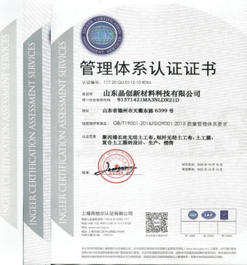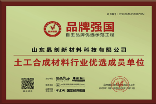 自创办以来,公司视品牌为生命,杜绝短视行为,杜绝以次充好,严把质量关,时刻保证产品合同执行和客户利益。2021年5月份,“晶创”品牌的64吨聚丙烯长丝防粘土工布中标、在国道314阿克苏段高等级公路中使用,产品的抗张强度和抗冲击强度、耐候均一性能符合或超过设计要求,产品首创超过6.5米幅宽,保证了工程施工更加快捷、降低了工程施工的综合造价,再加之公司细致周到的服务,赢得了客户的高度认可。