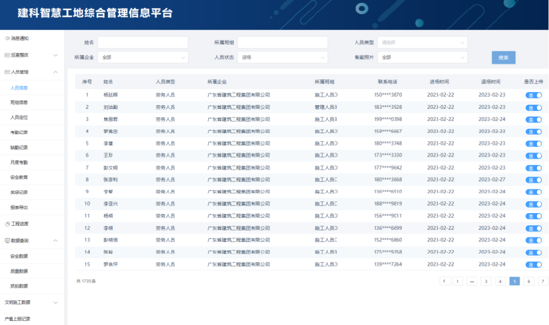 劳务实名制管理、实时考勤、安全教育、奖惩等数据记录、统计分析。